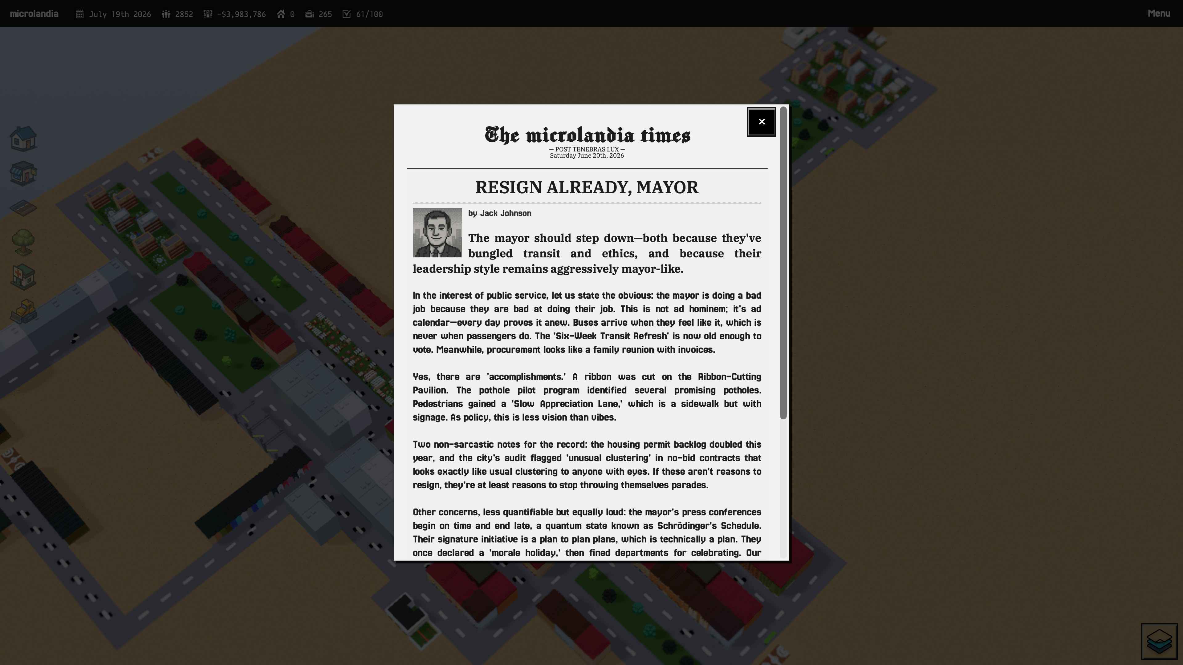 - A newspaper tracks your every move and reports on all the city's happenings and problems you will be blamed for.